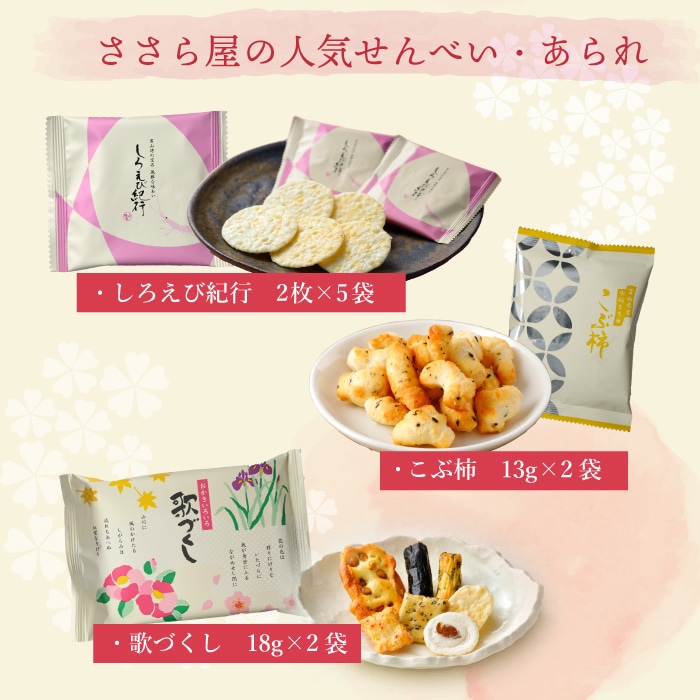 ささら屋の定番商品しろえびせんべいや香ばしいあられ、おせんべいなど詰め合わせたコンパクトな食べ切りサイズ。